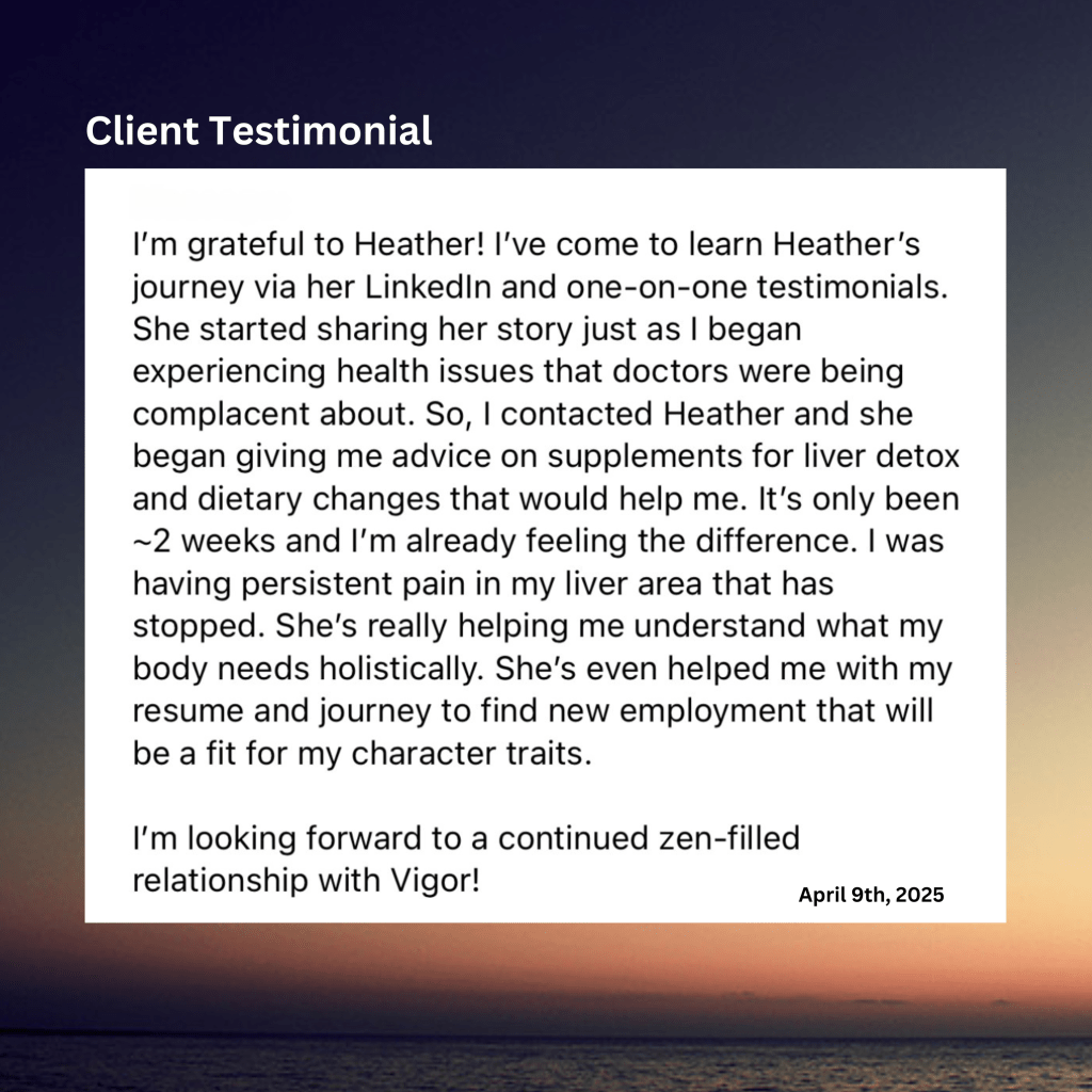 Contact New Zen Vigor to schedule a one-on-one coaching session to co-create the strategy for your holistic health success. Preview New Zen Vigor services here.